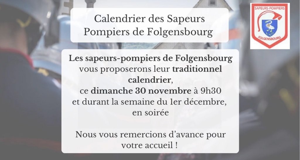 Les sapeurs-pompiers de Folgensbourg viendront vous proposer leur traditionnel calendrier, aujourd'hui et au courant de la semaine prochaine.